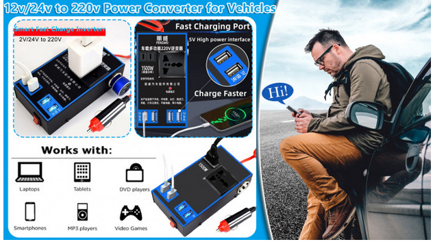 【Fast Charging】This 1500W car power inverter features dual 110/220V AC outlets and 4 USB ports. 5V 3A/dual USB ports can automatically detect your devices to deliver optimal charging speed, great for your kindles, iPhones, iPads, tablets, MP3 players, cameras, and other mobile devices.